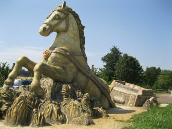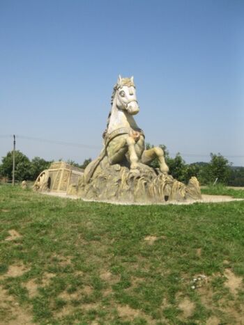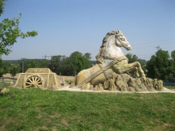 Kůň vytahující povoz z bažin byl sochou vytvořenou na zakázku. Zadal ji pan Štefáček, majitel Ranče v Hamrech. Socha v nadživotní velikosti je nezapomenutelným bodem v obci Hamry nad Sázavou. Jezdecký Klub Na Ranči, Hamry.