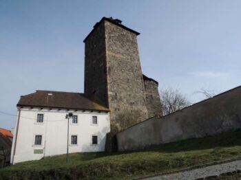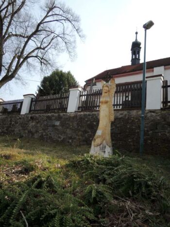 U hradu, přes silnici, je kostel sv. Šimona a Judy před kterým stojí dřevěná socha Anděla vyřezaná Vlastimilem Brandou.