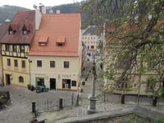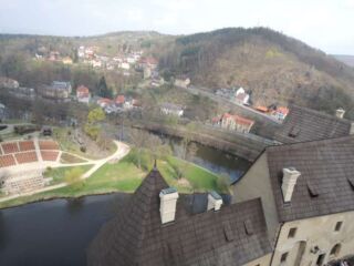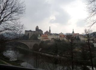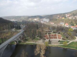 Na hrad a do města Loket je možné se dostat přes řeku Ohři po tříobloukovém železobetonovém silničním mostě z roku 1936. Most je 116 metrů dlouhý a jeho hlavní oblouk má rozpětí 74,6 metru (obr. 22) .