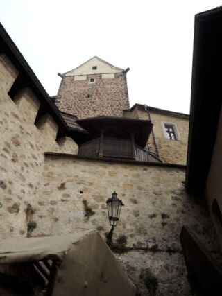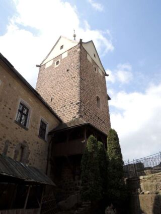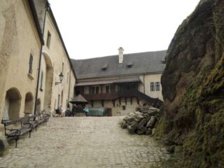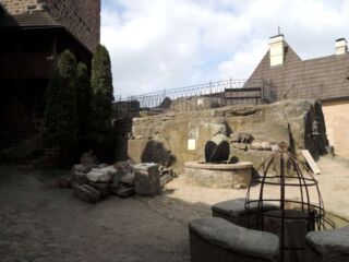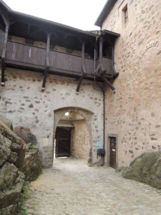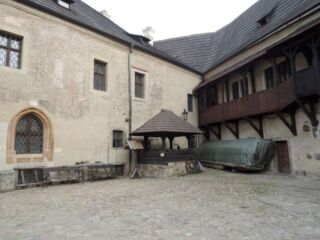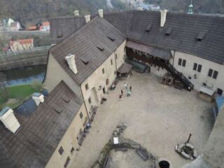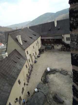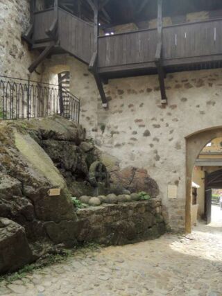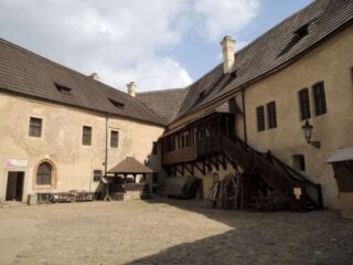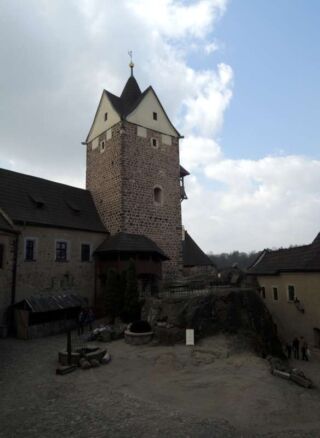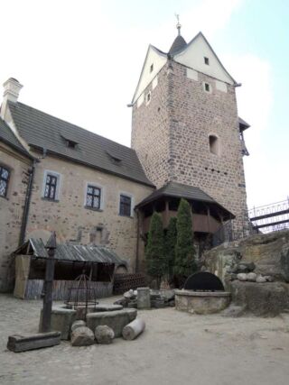 Na nádvoří se nachází studna (obr. 26), původně zásobní cisterna, která byla během 15. století prohloubena až na úroveň řeky Ohře tj. do 55 metrů. Poblíž je k vidění bronzová soška Gottstaina (obr. 17) znázorňující samotného vládce Loketských skal, podsvětí a kamenů. A nepřehlédnutelná je románská věž se čtvercovým půdorysem (obr. 14,16,24) vysoká 26 metrů, ze které je krásný rozhled na město Loket, řeku Ohři a okolí (obr. 19-23) .