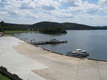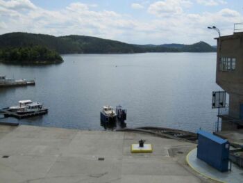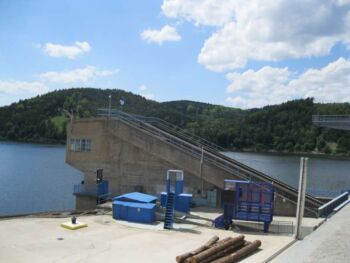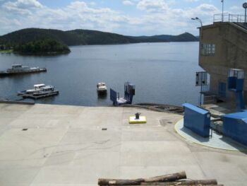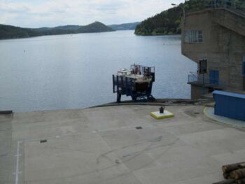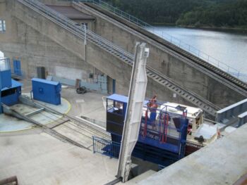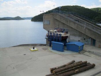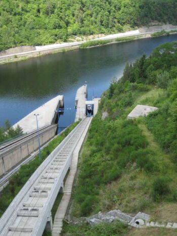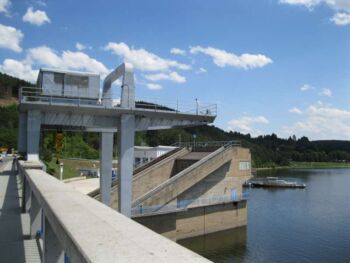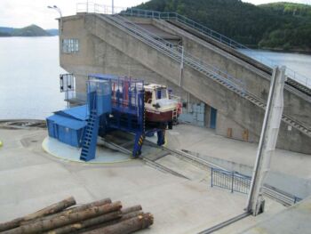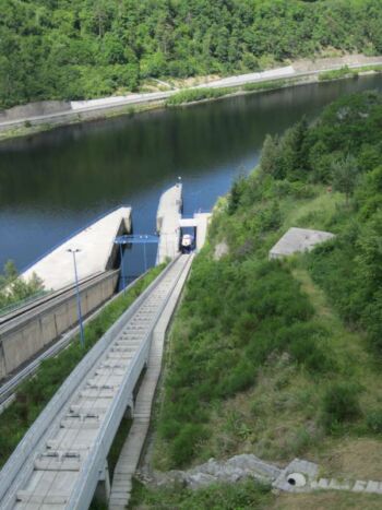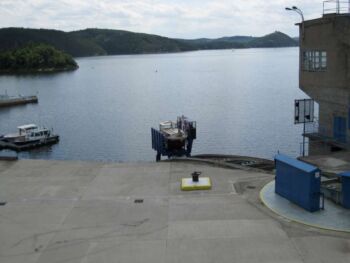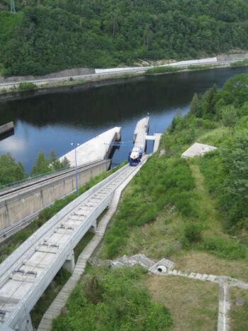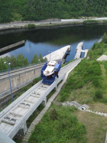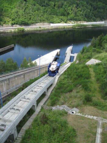 Na pravém břehu je umístěno plavební zařízení. Lodní zdvihadlo pro lodě 300t má sklon 22 stupňů a délku 190 m. Vybudována je pouze jeho stavební část. Lodě do výtlaku 3,5 t a šířky 2,6 m jsou přepravovány na plošinovém vozíku taženém elektrickým navijákem po kolejové dráze.